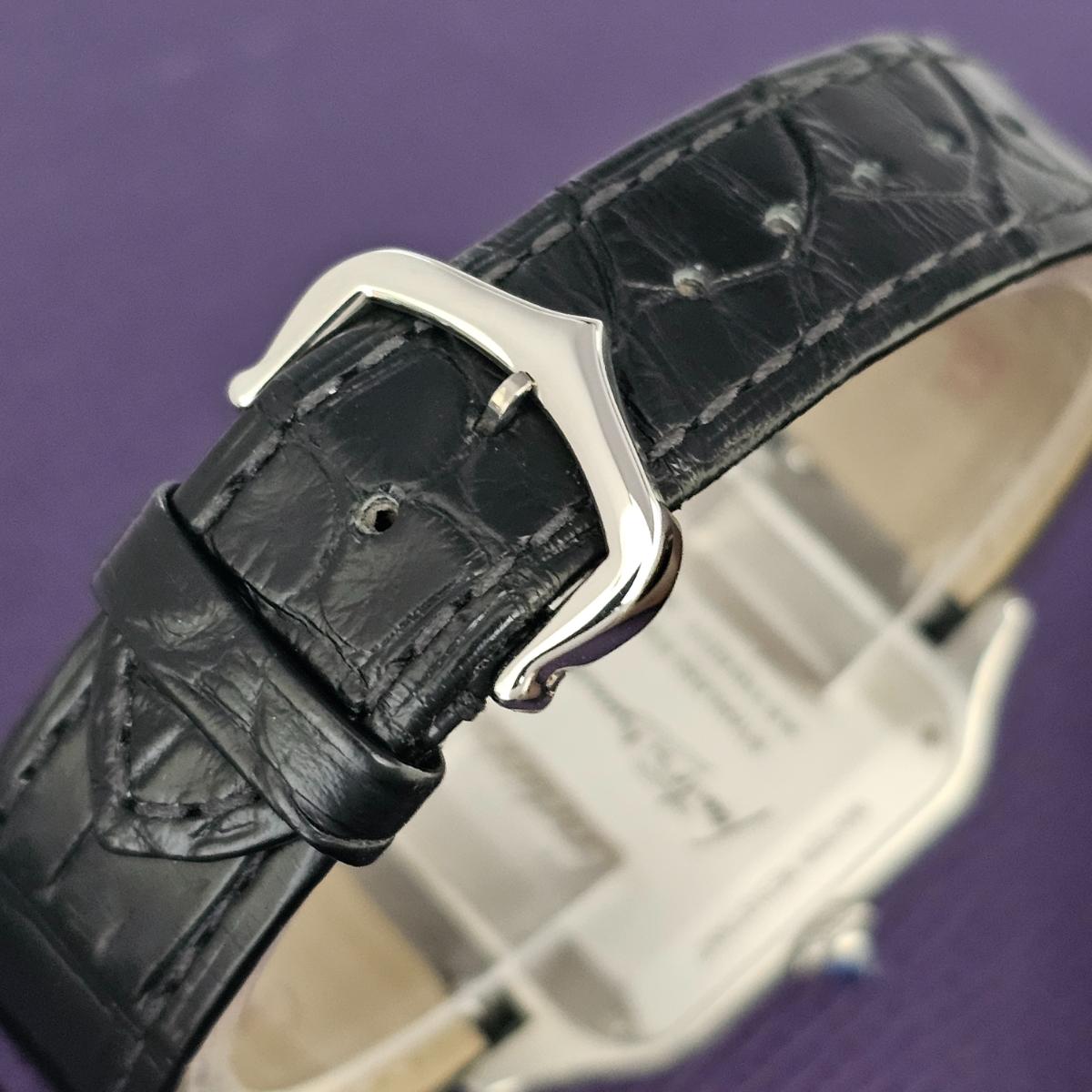The Cartier Santos-Dumont ref. WSSA0046 is a super clean, dressy take on one of Cartier’s most historic designs, originally created in 1904 for aviator Alberto Santos-Dumont. This modern version comes in a slim steel case (about 43.5 × 31.4 mm but only ~7.3 mm thick), which makes it wear really elegant and almost flat on the wrist. The standout detail is the black lacquer dial with Roman numerals, paired with a matching lacquered bezel and those signature exposed screws, giving it a slightly more modern, monochrome look compared to classic white-dial Santos models. It runs on the hand-wound calibre 430 MC with around 38 hours of power reserve.