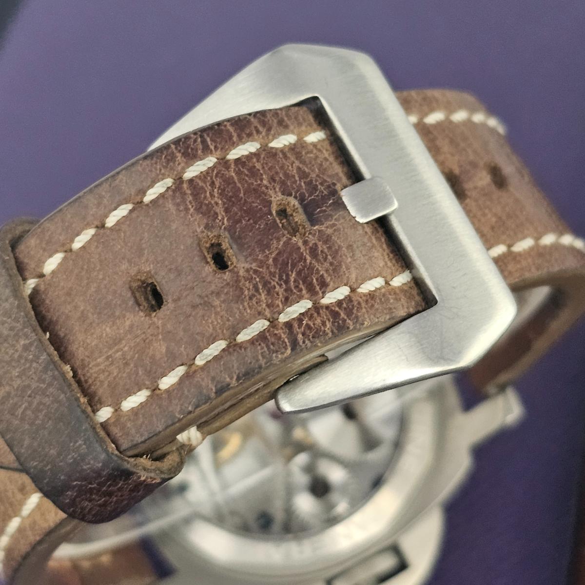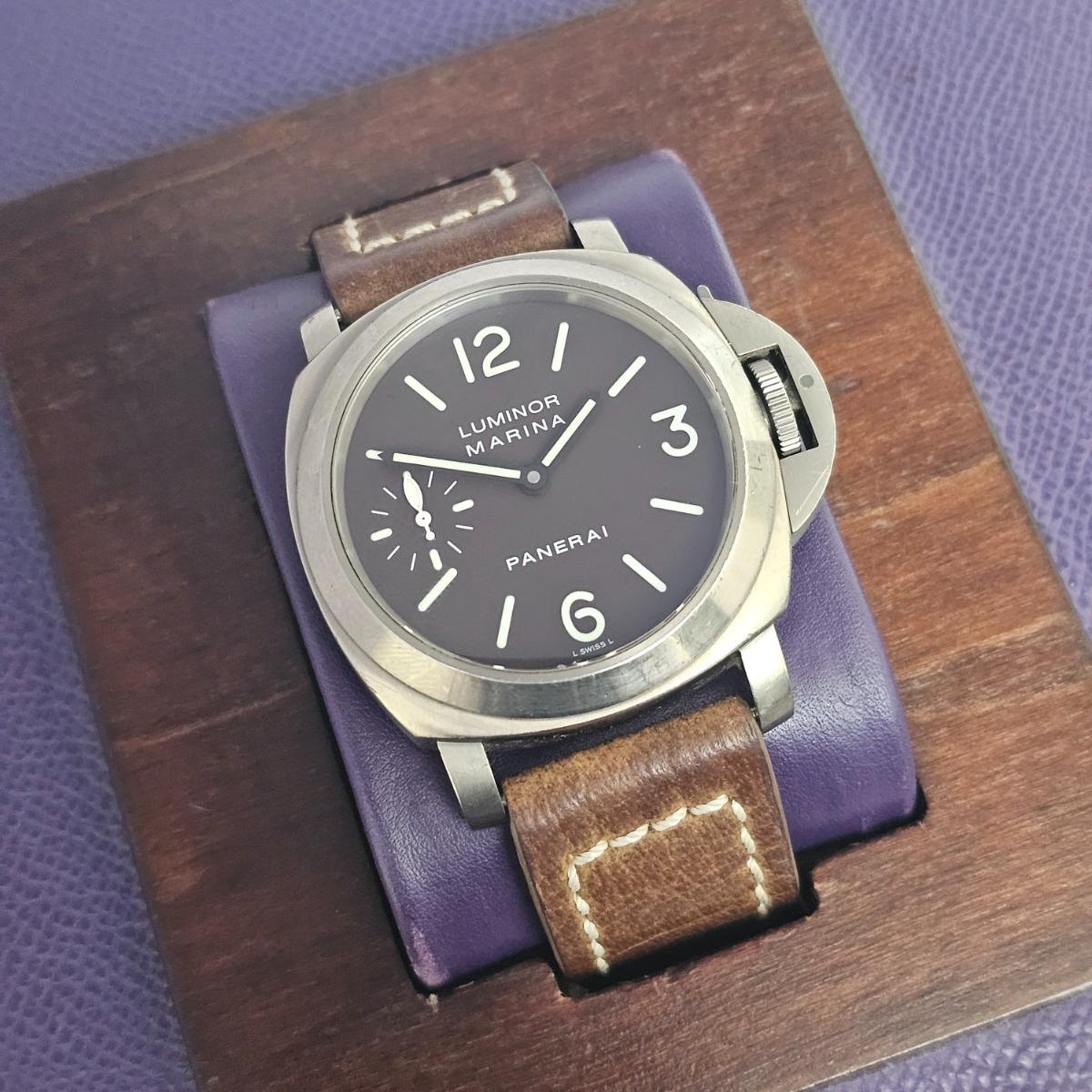 The Panerai reference PAM00118 is part of the Luminor Marina collection, produced between 2002 and 2003, and is notable for its lightweight yet robust titanium case paired with a distinctive brown “tobacco” dial. Measuring 44 mm, it features the hand-wound OP XI movement with a power reserve of around 56 hours, a sapphire crystal, and water resistance up to 300 meters, reflecting the brand’s historical roots in professional diving watches. Its cushion-shaped case, signature crown-protecting bridge, and exhibition caseback combine functionality with classic Panerai design, making the PAM00118 a relatively rare and collectible model due to its short production run.