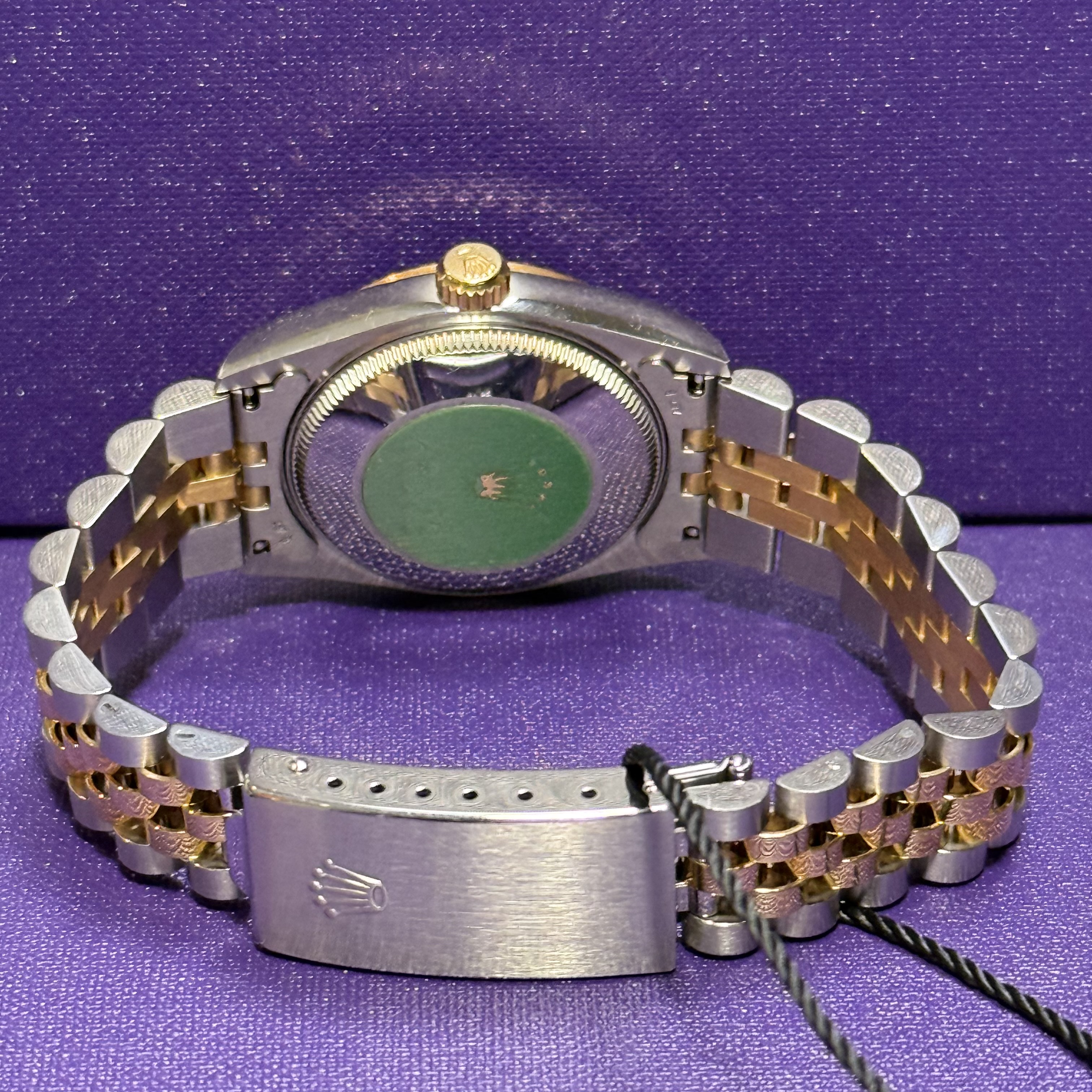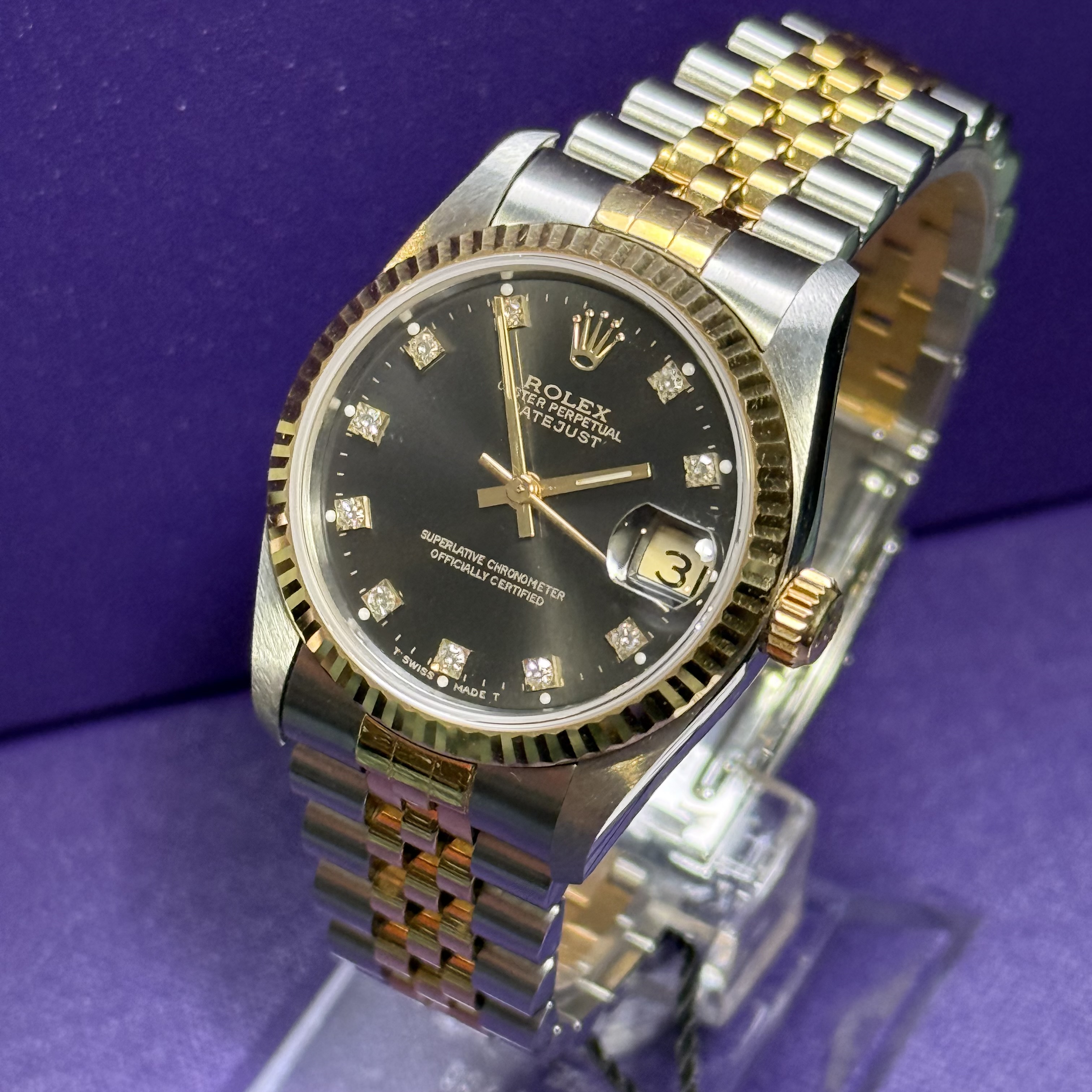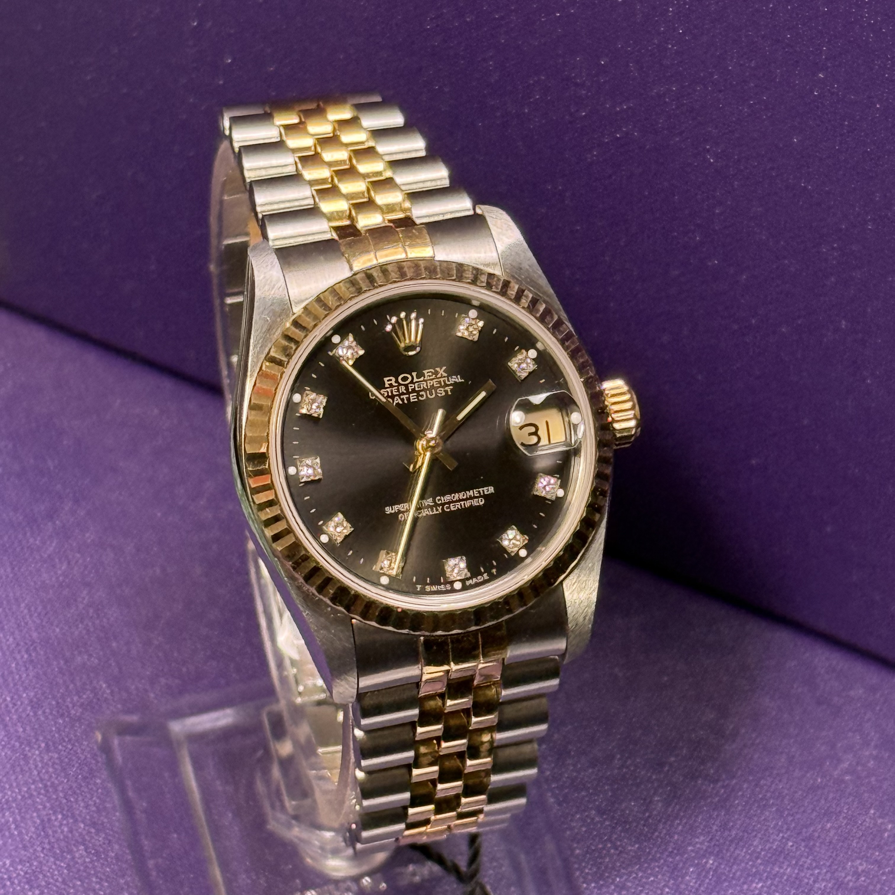 olex Datejust Ref. 68273 – Black Dial, Jubilee Bracelet The Rolex Datejust Ref. 68273 embodies timeless sophistication in a perfectly balanced midsize case. Crafted from stainless steel and 18k yellow gold, it captures Rolex’s signature blend of durability and luxury. This example features a striking black dial with applied gold hour markers, offering a sharp contrast that enhances its elegant, versatile character. Paired with the iconic Jubilee bracelet, it delivers both comfort and classic Rolex charm. Powered by the Calibre 2135 automatic movement, the 68273 combines precision, style, and everyday wearability — a refined statement piece suited for any occasion. This example is in excellent condition, recently serviced, and comes complete with its original box and papers.