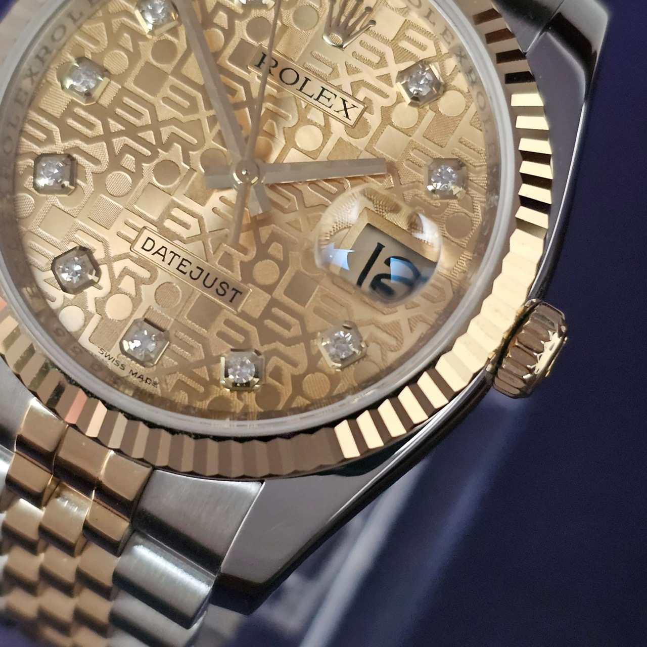 The 116233 is the Datejust that manages to be classic and bold at the same time. Its 36mm case sits perfectly on the wrist — familiar, balanced, and just the right size for everyday wear. The two-tone steel and 18k yellow gold combination gives it a sense of luxury without feeling over the top. The champagne computer dial is what really makes it pop: distinctive, playful, and unmistakably Rolex, with those repeating “ROLEX” motifs adding a modern, textured twist. The fluted gold bezel catches the light beautifully, while the Jubilee bracelet keeps it elegant, comfortable, and effortlessly versatile.