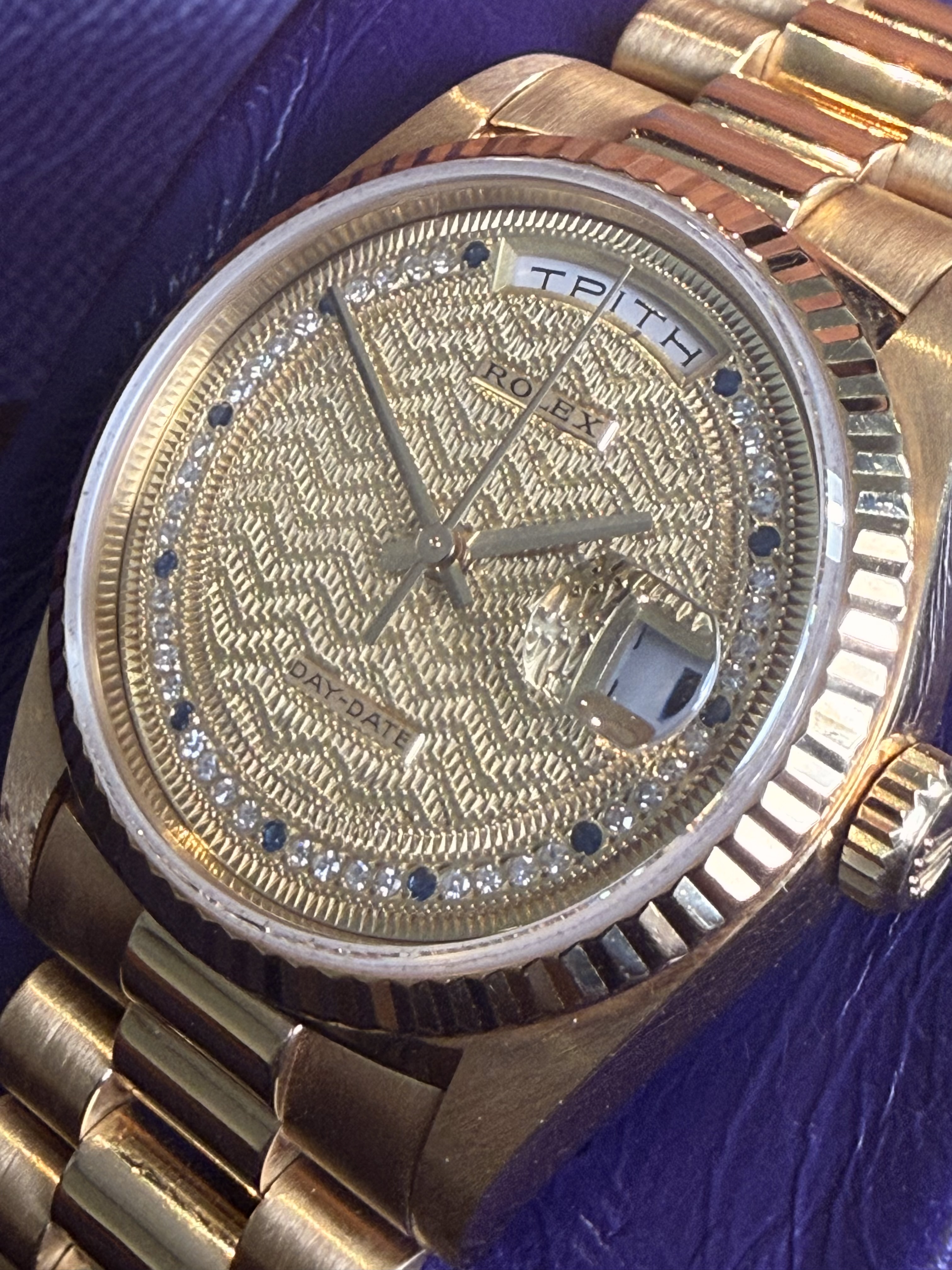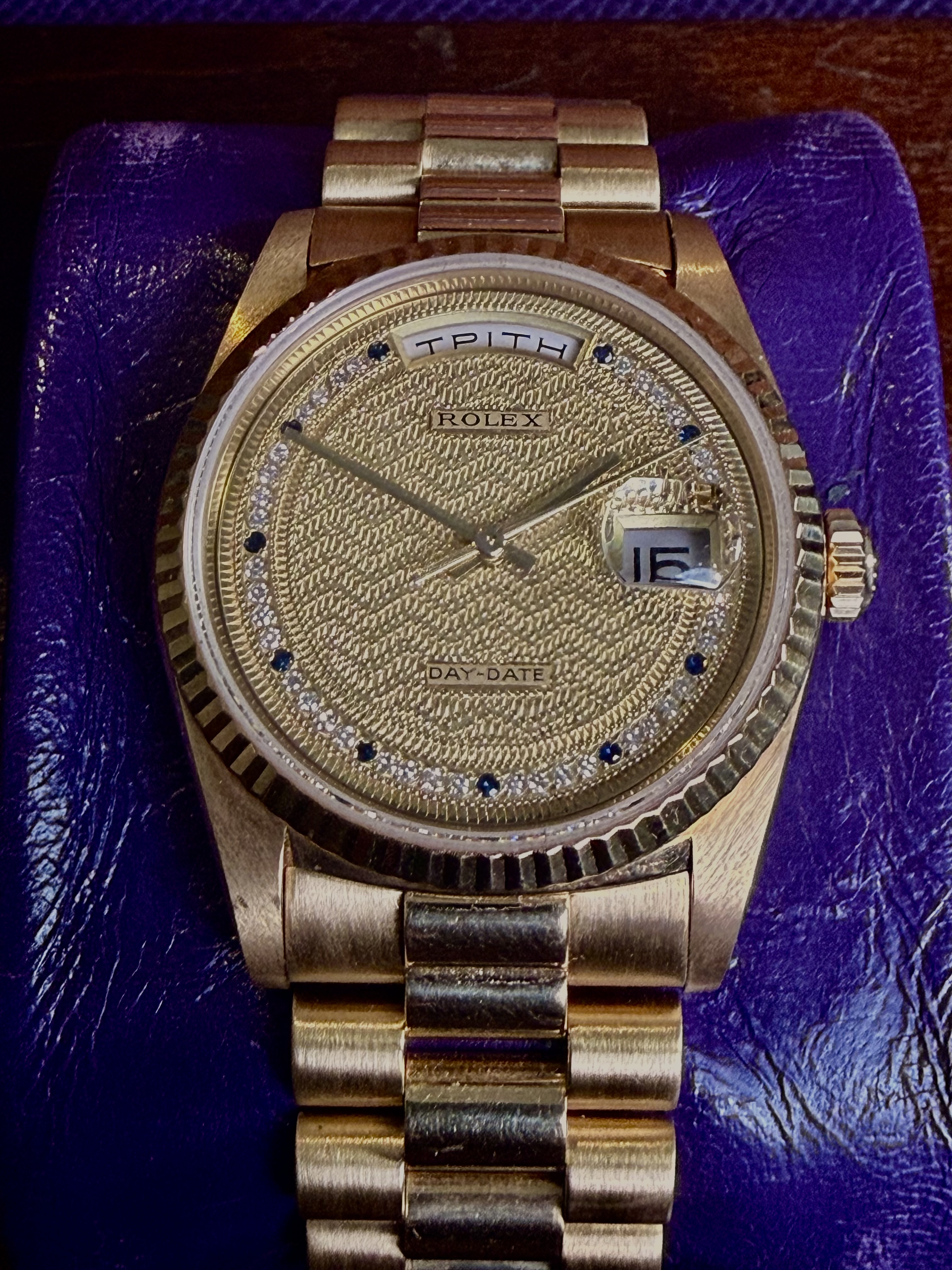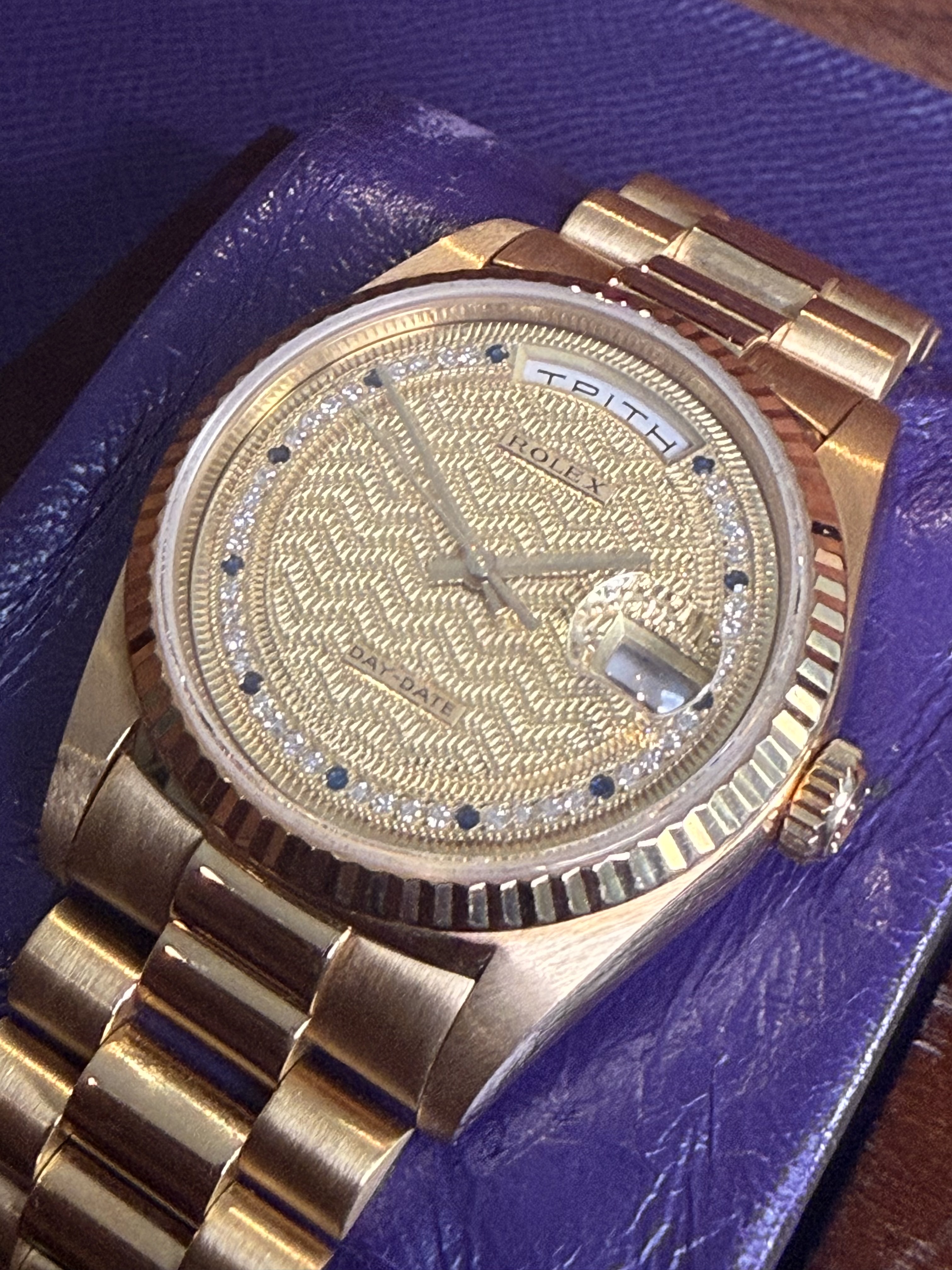 The Rolex Day-Date 18238 – The Signature of Prestige Few watches capture the essence of Rolex prestige quite like the Day-Date 18238. Introduced in the late 1980s, it represents the perfect balance between mechanical mastery and timeless elegance — a watch designed not just to tell time, but to define it. Crafted exclusively in 18k yellow gold and fitted with the iconic President bracelet, the 18238 became a symbol of success and refinement. Its dual apertures — showing both the date and the day spelled out in full — were groundbreaking at the time and remain unmistakably Day-Date. Inside beats the reliable Caliber 3155, known for its precision and durability. Yet beyond its technical brilliance, the 18238 carries a quiet authority — the kind of watch that doesn’t demand attention, but naturally commands it. Collectors value its classic 36 mm proportions, warm gold tones, and the way it bridges vintage character with modern performance. The Day-Date 18238 isn’t just worn — it’s inherited, celebrated, and remembered. A golden testament to Rolex’s pursuit of perfection and the enduring power of understated luxury.
