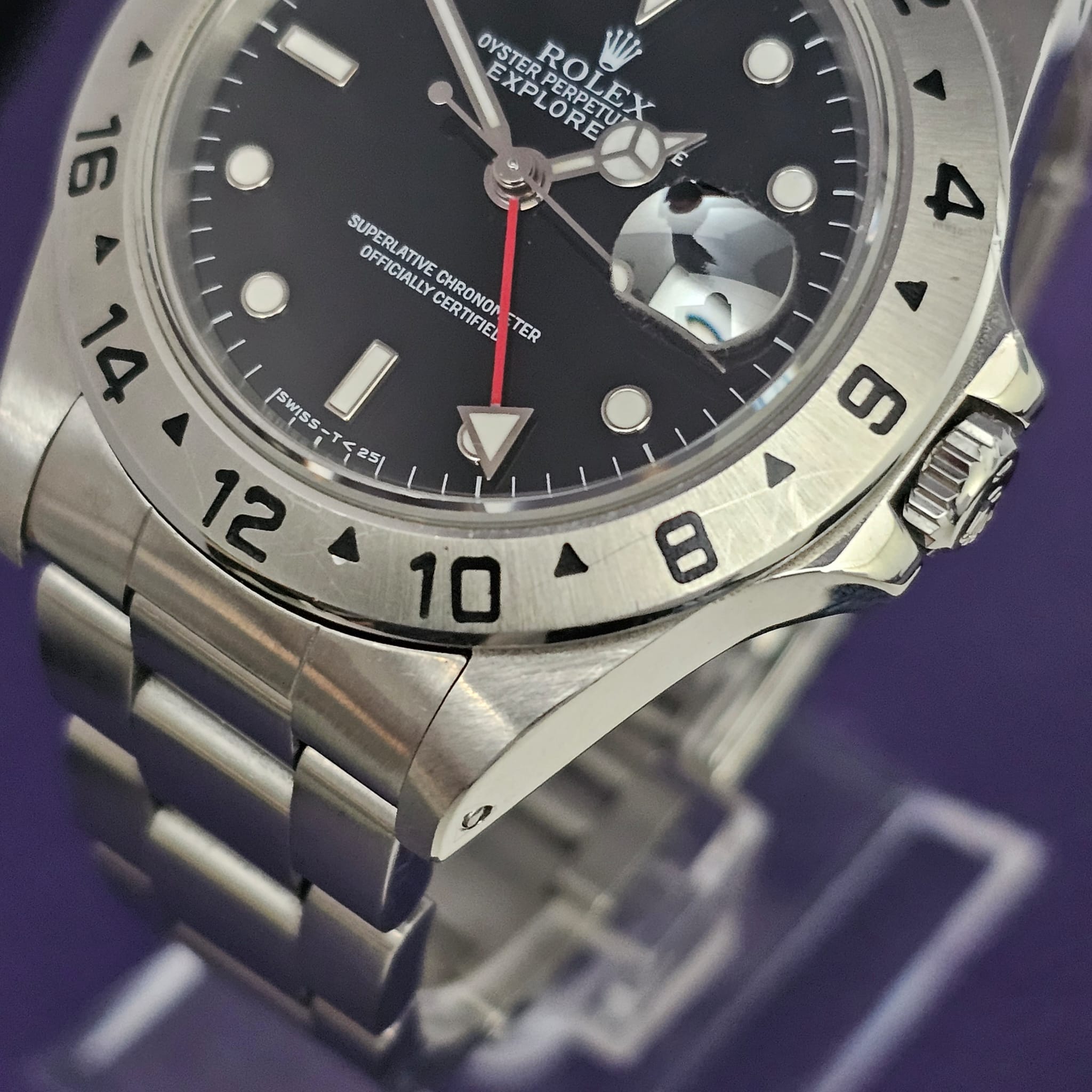 The Rolex Explorer II 16570 tells the story of a classic Rolex built with quiet confidence. Its balanced 40 mm stainless-steel case and black dial create a clean, timeless look that feels both sporty and refined. The crisp white hour markers and Mercedes hands stand out clearly against the dark dial, while the red 24-hour hand adds a subtle touch of color. A fixed steel bezel engraved with 24-hour markings gives the watch its distinctive character. Inside, the automatic Calibre 3185 movement keeps reliable time with smooth precision. Together, these details make the Explorer II 16570 a watch that blends vintage charm with everyday practicality.