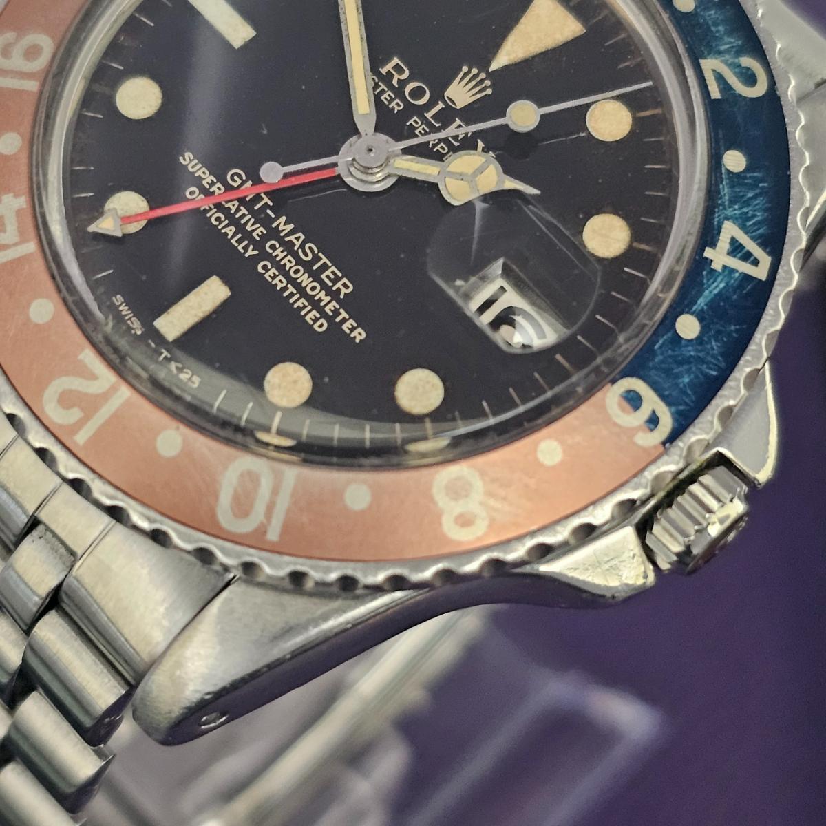 The Rolex GMT-Master ref. 1675 from 1964 with a “Pepsi” bezel and gilt dial represents one of the most desirable early executions of this iconic pilot’s watch. Housed in a 40 mm stainless steel Oyster case with early crown guards, it is powered by the automatic calibre 1565 and features a bidirectional 24-hour bezel with the red-and-blue “Pepsi” insert, originally developed for airline pilots to track a second time zone. This particular configuration is paired with a Jubilee bracelet, adding a more refined and comfortable feel compared to the sportier Oyster bracelet, and enhancing its vintage charm. Altogether, the combination of gilt dial, Pepsi bezel, and Jubilee bracelet makes the this 1675 very desirable.
