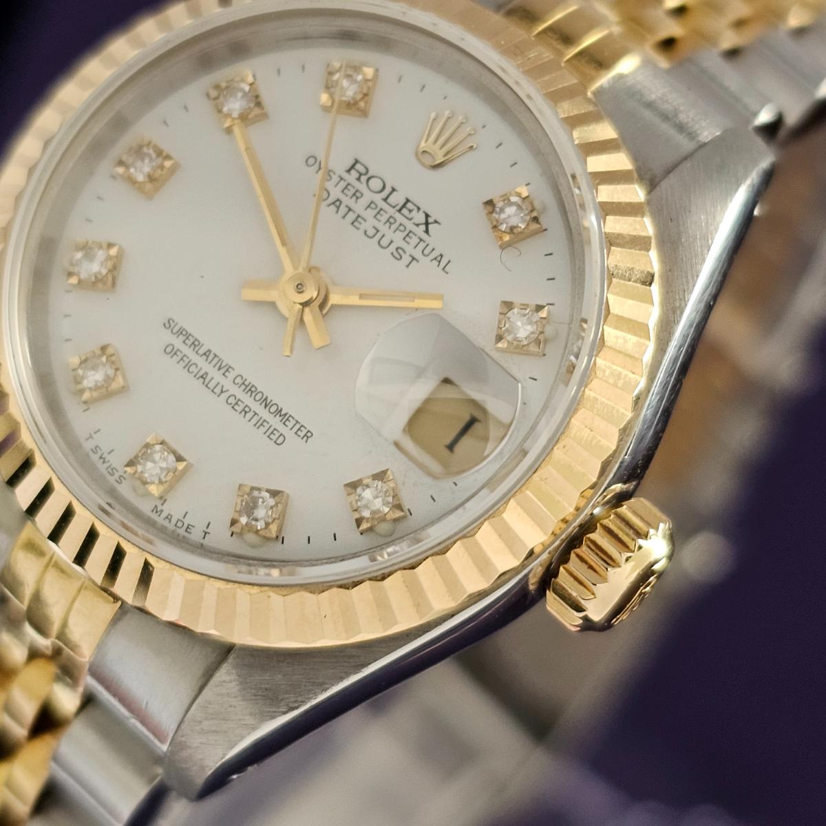 The Rolex Datejust 69173 with a silver dial and diamond hour markers is a classic women’s watch that blends elegance with everyday practicality. Made in stainless steel and 18k yellow gold, it offers a versatile look that works just as well at the office as it does at special events. The 26 mm case is perfectly sized for a comfortable, refined fit on the wrist. The bright white dial is clean and easy to read, while the diamond hour markers add just the right touch of sparkle to make the watch feel special.