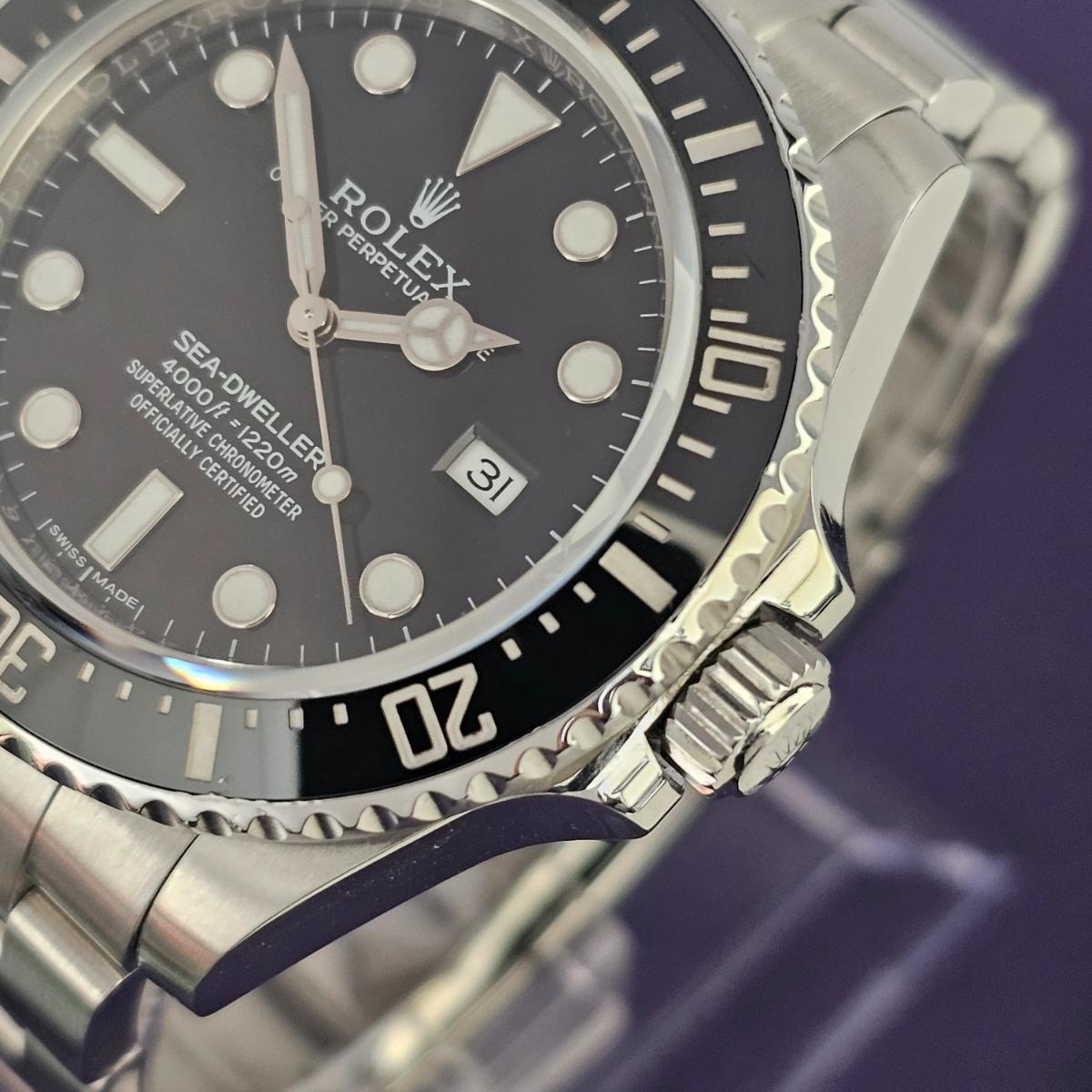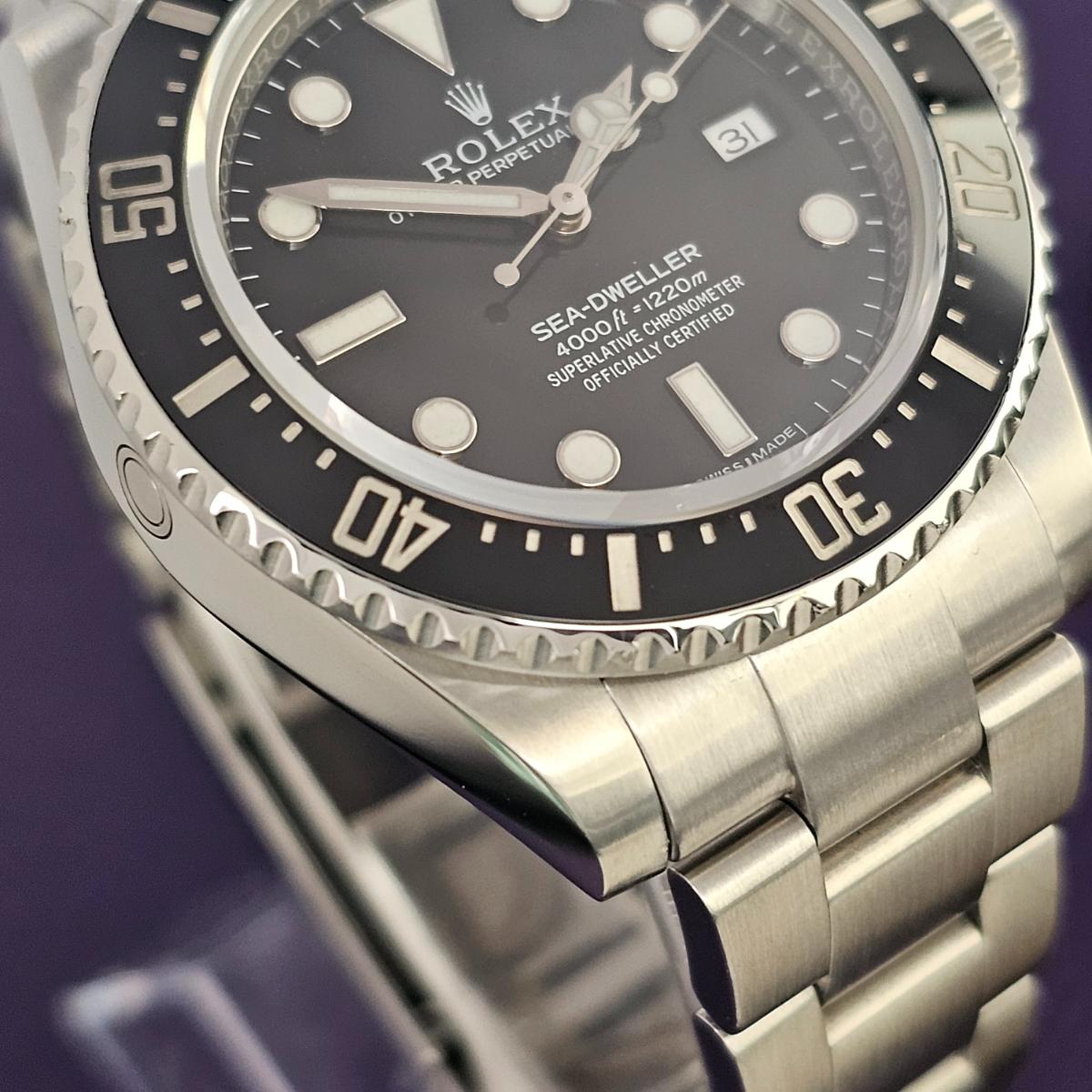 The Rolex Sea-Dweller ref. 116600, often nicknamed the “SD4K,” was introduced in 2014 as a modern revival of the classic Sea-Dweller and produced for only a short period until 2017, making it one of the most short-lived contemporary Rolex sports models. It features a traditional 40 mm Oystersteel case with an Oyster bracelet, powered by the reliable automatic calibre 3135, and offers a professional-grade depth rating of 1,220 meters (4,000 feet) along with a helium escape valve for saturation diving. The watch combines vintage-inspired proportions with modern upgrades such as a black Cerachrom ceramic bezel with fully graduated minute markings and a “Maxi” dial with Chromalight lume for enhanced legibility. Notably, it retains the clean sapphire crystal without a Cyclops lens, staying true to the Sea-Dweller’s tool-watch heritage.